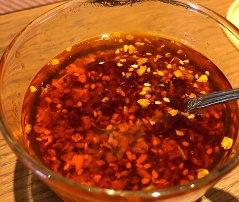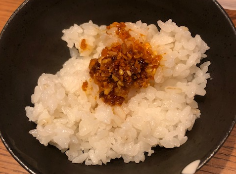 麦ごはんが食べ放題でテーブルに置いてある自家製食べるラー油も絶品です。